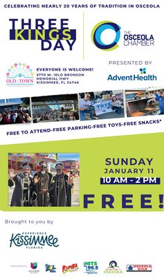 The Feast of the Three Kings is an intricate part of Latin Folklore. Traditionally, this day is very important, especially for children, for it is on this eve that they will receive their gifts. The celebration will include a visit from the Three Kings; FREE Hotdogs; FREE popcorn, cotton candy or snow cones; and a toy for children under 11. Bikes and tablets will be given away by raffle throughout the event.